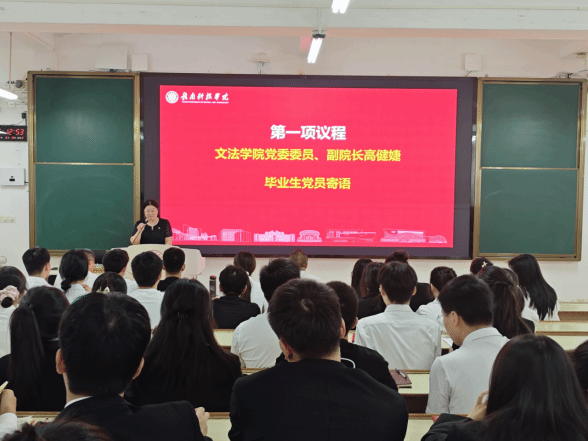 大会第一项议程,由学院高院长为毕业生党员寄语。 高院长首先代表学院向圆满完成学业的毕业生党员们表示热烈祝贺。他深情回顾了同学们在校期间的成长与贡献,并提出了殷切期望:希望大家永葆共产党员的政治本色,将个人理想融入国家发展伟业,在未来的学习与工作岗位上,坚守初心、脚踏实地、砥砺前行,成为担当民族复兴大任的时代新人。高院长的寄语语重心长,在现场毕业生党员中引起热烈反响。
