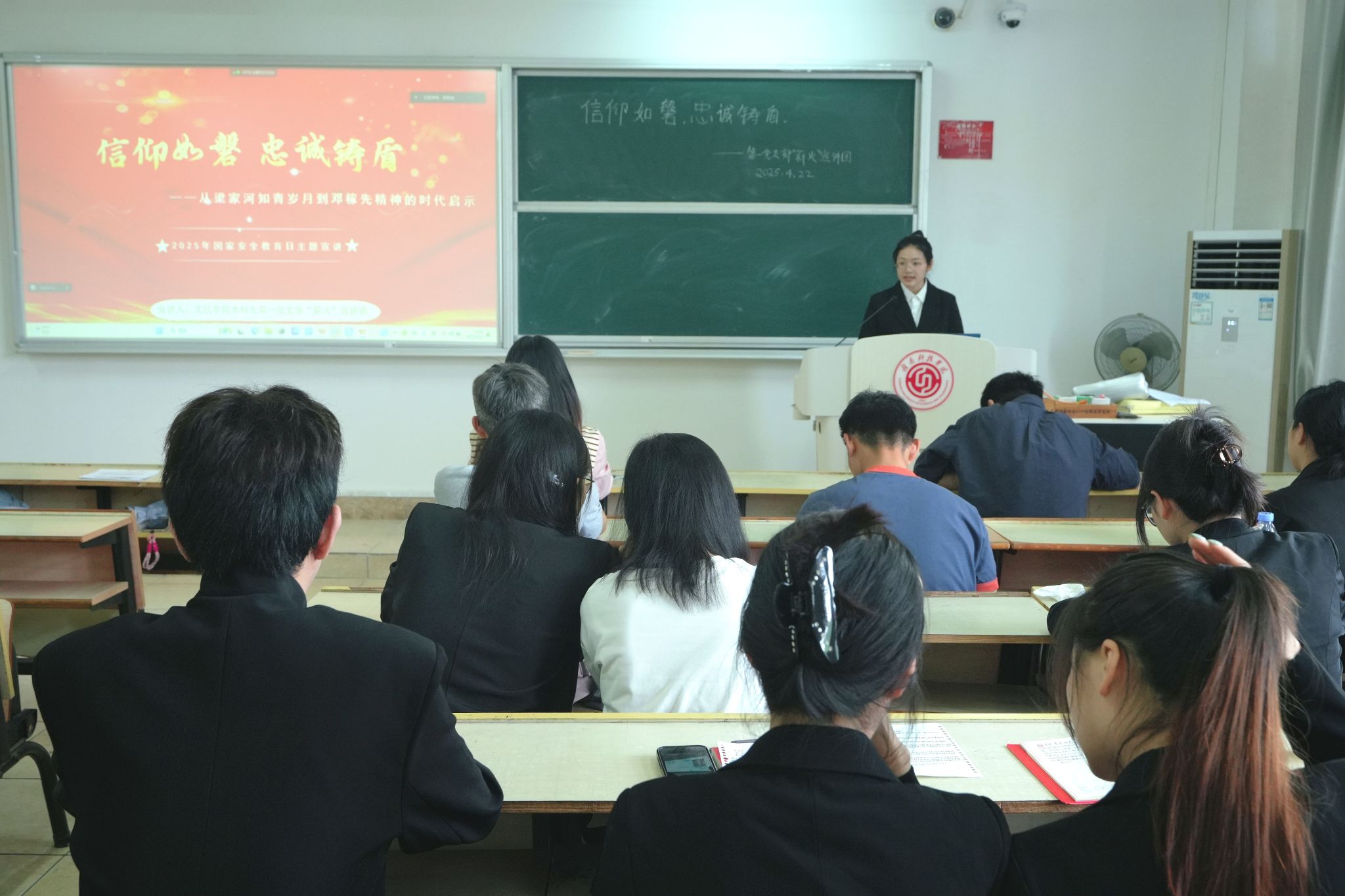 宣讲员黄怡祺从习近平总书记的梁家河岁月讲起,“跳蚤关、饮食关、劳动关、思想关”,青年习近平在艰苦环境中磨砺意志,带领村民打淤地坝、建沼气池,用实干诠释了“为人民做实事”的担当,用奋斗展现了“为人民谋幸福”的信仰。随后,宣讲员分享了“两弹一星”元勋邓稼先的感人事迹,28年隐姓埋名,在戈壁荒漠中带领团队攻克核技术难关,用生命践行“干惊天动地事,做隐姓埋名人”的初心誓言,为国家安全筑牢坚实防线。最后,宣讲员通过真实案例警示青年学子做到“筑牢思想防线、练就过硬本领、争做先锋表率”,并现场领誓:“做一块梁家河的热土,扎根中国大地;做一根永不生锈的钢钉,筑牢安全防线……”。