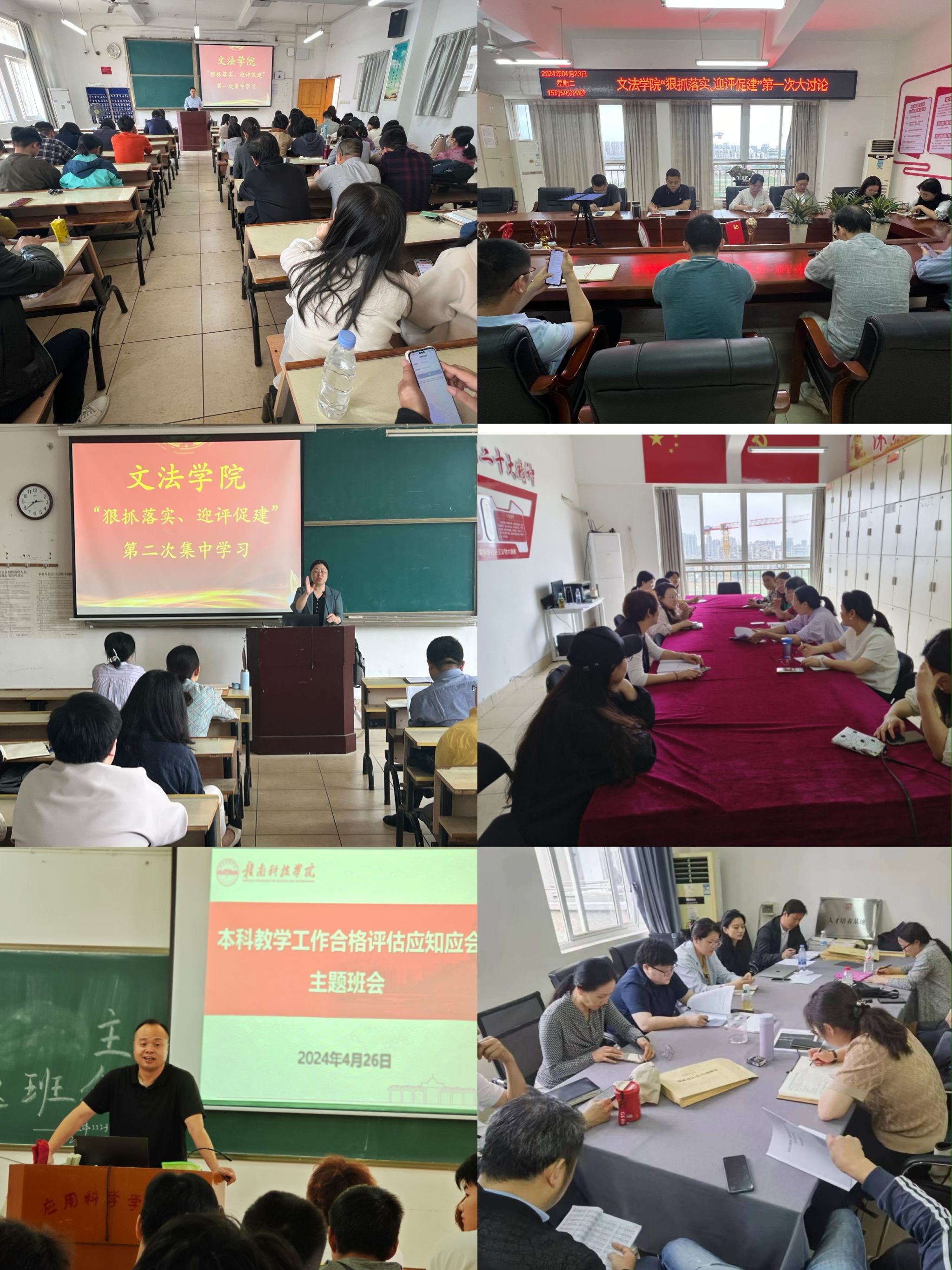 本次集中学习围绕师德师风及爱岗敬业及大抓落实迎评促建专题,各班级召开了本科教学工作合格评估应知应会主题班会,由高健婕、李国鹏、何建军、王军堂等人员就相关人员进行领学、介绍和解读。在集中学习后,精心编排了六个教职工小组开展讨论交流,每位教职工立足岗位职责,聚焦合格评估和教育教学高质量发展谈想法,查不足,明确个人今后的努力方向及工作计划。