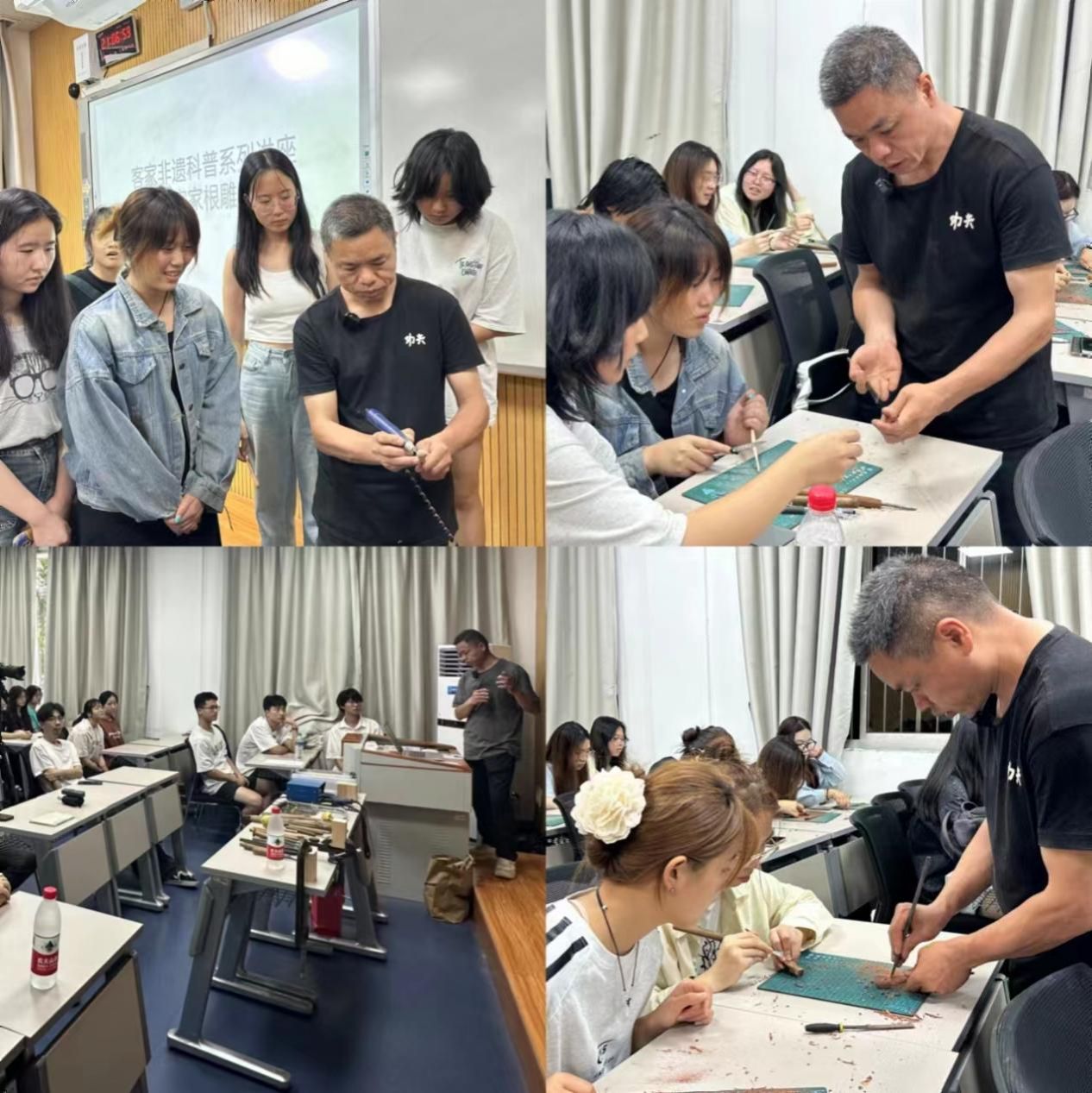 非遗传承人付先斌向同学们介绍了“客家根雕”的起源与发展,并向同学们分享自己的根雕作品和创作经历,期间,以一位同学作为模特,现场展示根雕的技法,将讲座气氛推入高潮,他富有创造力的作品让大家深深感受到了“客家根雕”的艺术魅力,激发了同学们对“客家根雕”浓厚的兴趣,深刻体会了“执着专注、精益求精、一丝不苟、追求卓越”的工匠精神。