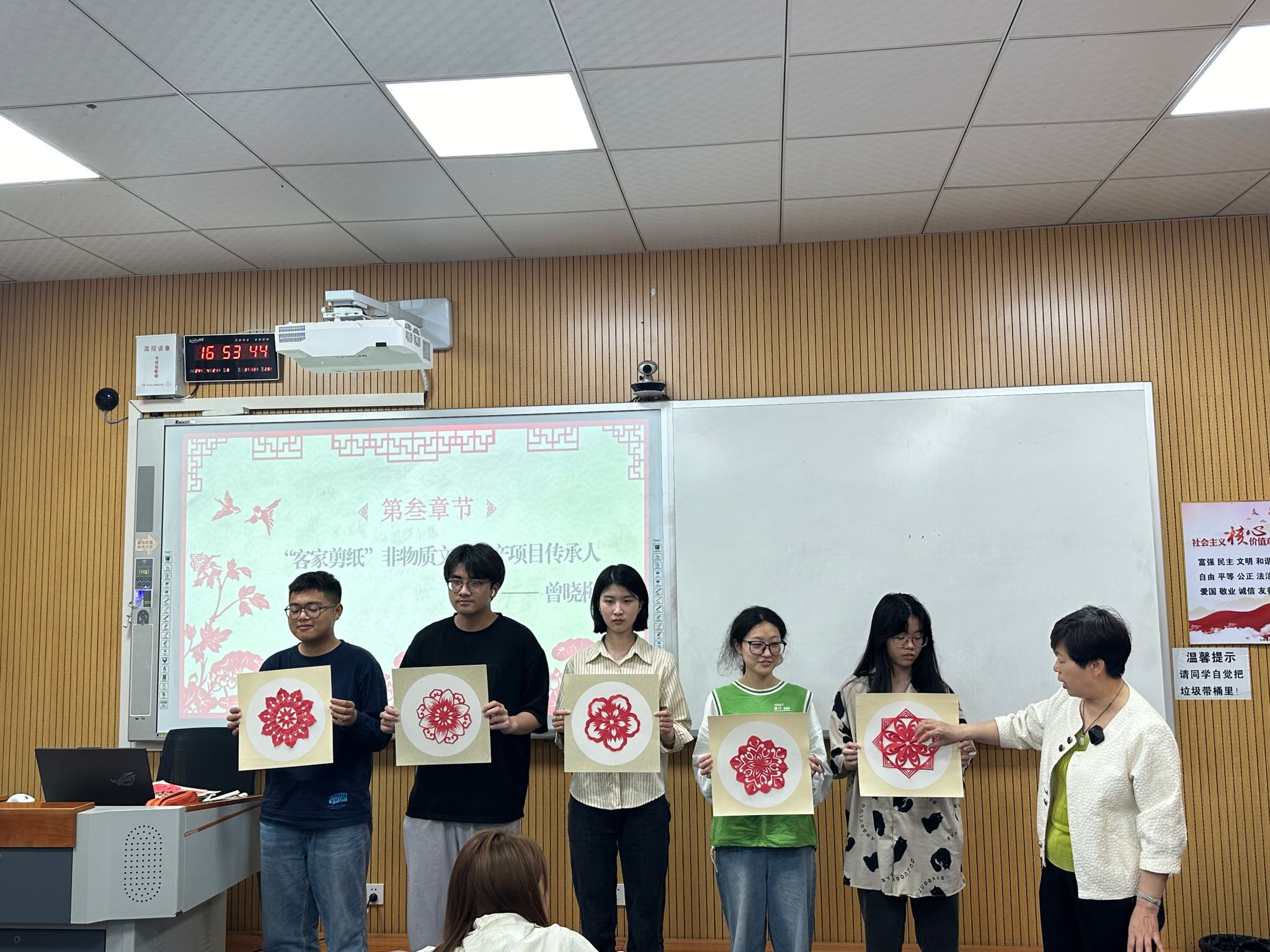 曾晓梅分享了她在剪纸艺术道路上四十多年的坚守,她对弘扬中华优秀传统文化的执着追求深深感染着同学们。她带领同学们了解了客家剪纸的基本工具、折纸技巧和剪纸技法,以及吉祥文字和图案运用等,耐心细致的指导同学们动手操作,让大家深深感受到了“赣南客家剪纸”的艺术魅力,更激发了同学们对传统文化的兴趣和参与非遗保护与传承的积极性。