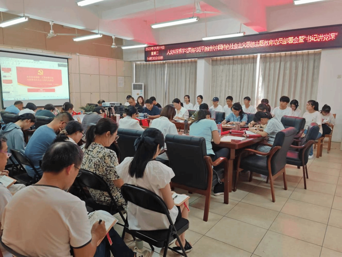 9月19号下午,人文科学系召开学习贯彻习近平新时代中国特色社会主义思想主题教育动员部署会,深入学习贯彻习近平总书记关于主题教育系列重要讲话和重要指示批示精神,全面贯彻落实中央、省委主题教育第一批总结暨第二批部署会议,市、学校主题教育动员部署大会精神。人文科学系全体师生党员参加会议,李国鹏主持会议并作动员讲话。