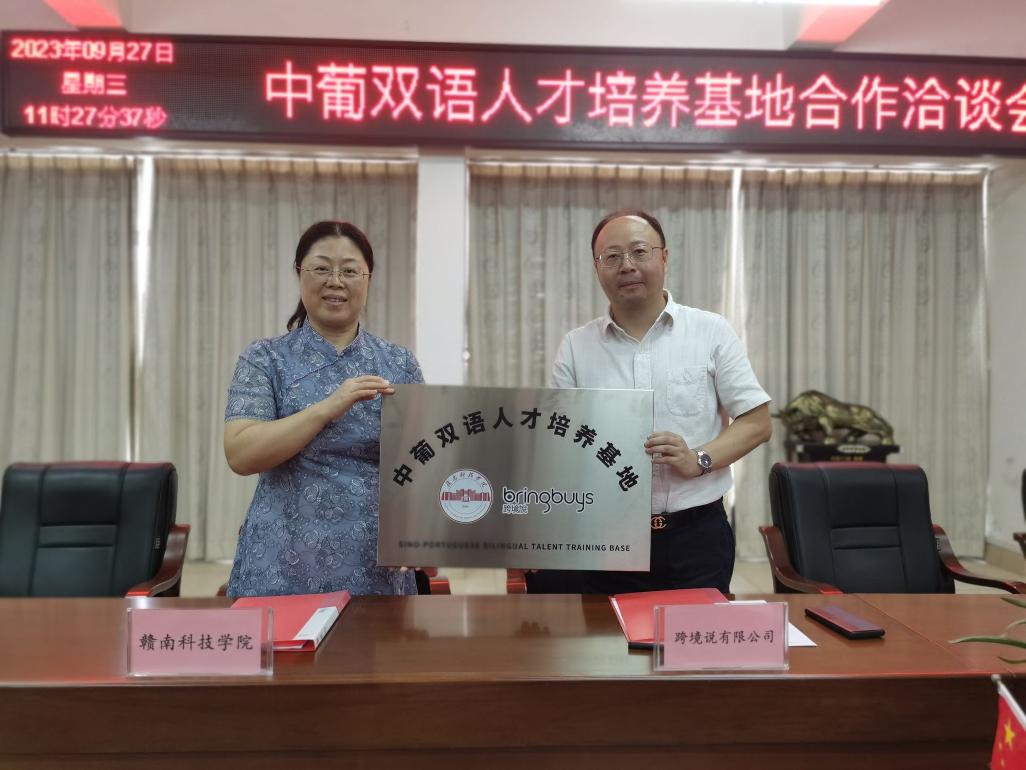 为加深学校与企业的沟通交流,推进校企深度合作,促进学科专业发展,助力学生未来发展。继7月29号我校葡语教师参观考查珠海横琴跨境说网络科技有限公司并就校企合作达成初步共识后,于9月27日上午,在主楼807会议室,召开中葡双语人才培养基地揭牌仪式及洽谈会。会议特邀教务办主任王水蓉,国交办主任涂敏出席,同时出席此次会议的还有珠海横琴跨境说网络科技有限公司副总裁罗兴一行,人文科学系主任高健婕,副主任何建军,葡语教研室全体教师和部分学生代表。