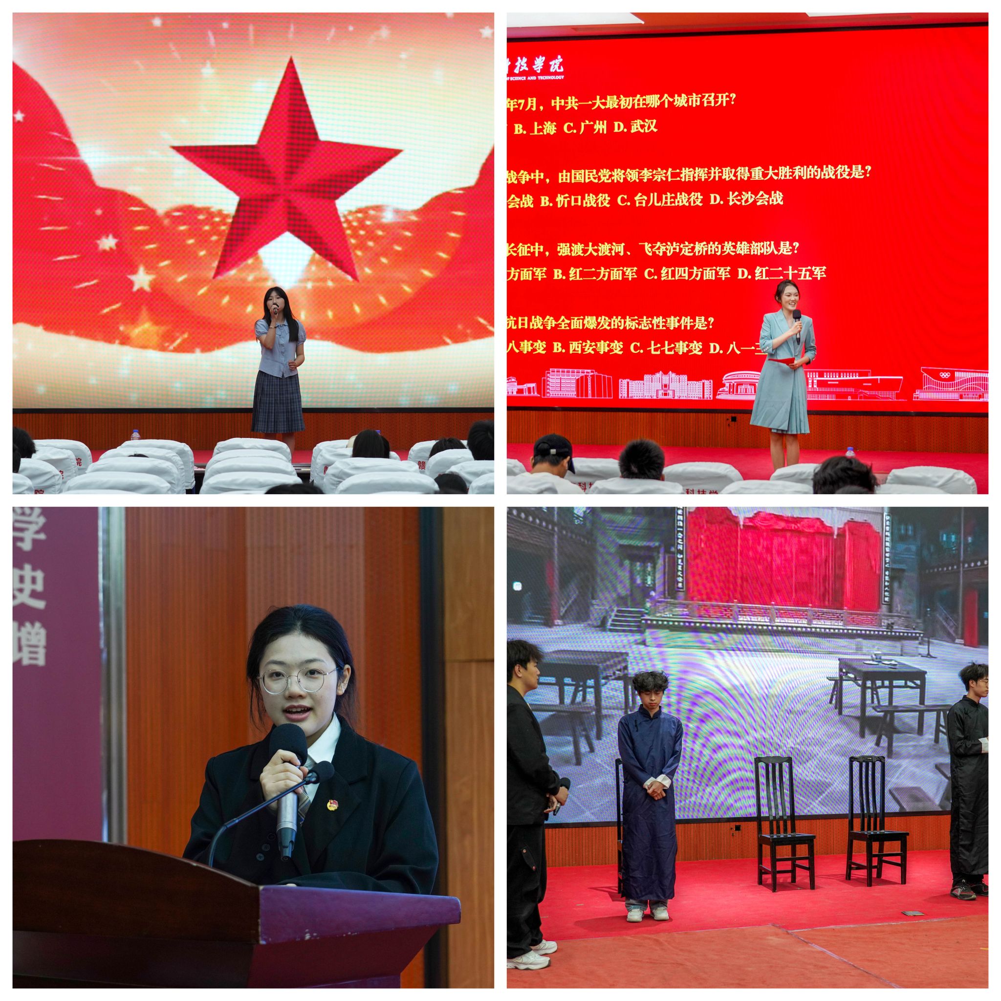 校团委声歌队英语232朱雨晨献唱《如愿》,表达青年使命与憧憬。中场问答环节观众积极参与。法学242黄怡祺讲述团课《从北京大学红楼看五四精神》探寻五四与抗战精神共鸣。经济管理学院会计241李好演绎情景剧《破春戏台》感人至深,赢得掌声。节目形式多样,激励青年奋进新时代。