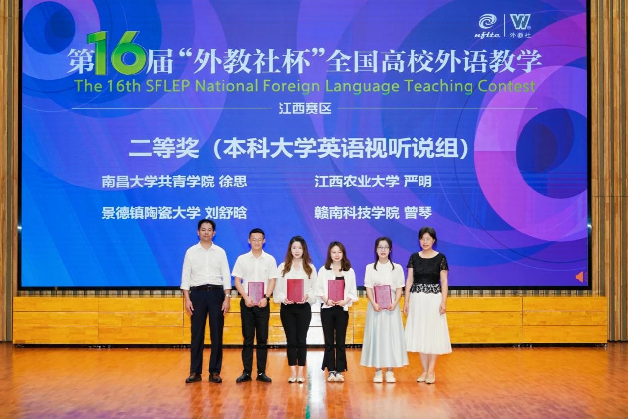“外教社杯”全国高校外语教学大赛始创于2010年,是中国高等教育学会发布的全国普通高校教师教学发展指数中位列首位的权威外语类赛事。本次大赛由江西省高等教育学会主办,江西科技师范大学和上海外语教育出版社承办,江西省外语学会协办,吸引了来自全省近40所高校参赛,竞争十分激烈。其中教学比赛分为“大学英语综合课组”、“大学英语(视)听说组”和“高职公共英语组”,微课比赛分为“大学英语组”和“大学日语组”。