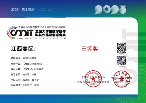近年来,WilliamHill威廉希尔一直坚持以大学生学科竞赛为抓手,努力拓宽学生获取知识的途径,提升学生应用能力水平。本次大赛WilliamHill威廉希尔精心组织,选派教师悉心指导,取得了优异的成绩。为充分做好本届比赛的参赛工作,我院由数字媒体艺术专业教研室主办,先举行了校内赛,共收到来自全院80余件参赛作品。教研室组织相关专业老师进行了细致的赛事介绍和技术辅导工作,认真遴选出了8件作品进入江西省赛,省赛中选出了3支优秀队伍进入2025年(第13届)全国大学生数字媒体科技作品及创意竞赛全国总决赛。
