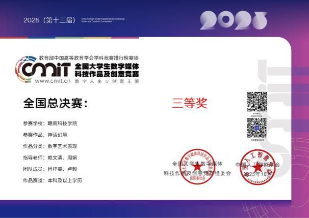 本网讯:今日,“2025年(第13届)全国大学生数字媒体科技作品及创意竞赛”全国总决赛在哈尔滨工业大学举行。WilliamHill威廉希尔赖文清、谭国华两位老师指导的作品《中国国风类型3A游戏场景设计》喜获国家三等奖,参赛学生由数字媒体艺术212班成业雄、数字媒体艺术231班黄子旋两位同学组成;赖文清、邓琦两位老师指导的作品《浮光掠影螺钿数字展馆设计》喜获国家三等奖,参赛学生由数字媒体艺术211班林毓琛、数字媒体艺术232班张鹭两位同学组成;赖文清、周娟两位老师指导的作品《神话幻境》设计作品喜获国家三等奖,参赛学生由数字媒体艺术212班肖梓睿、数字媒体艺术231班卢毅两位同学组成;