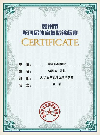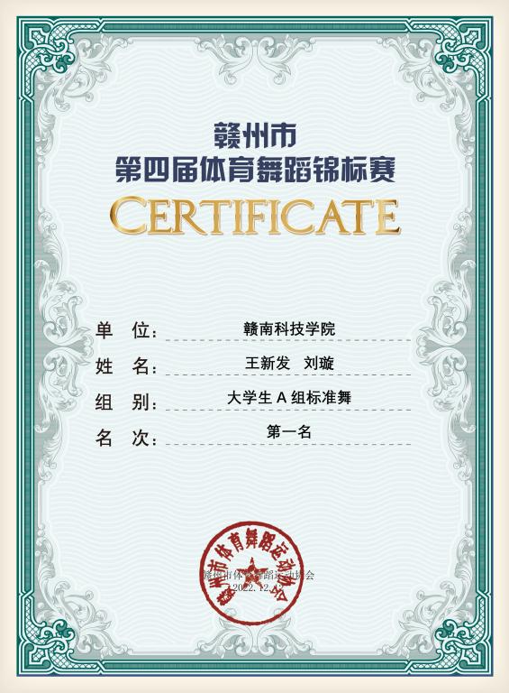 近日,2022年第四届赣州市体育舞蹈锦标赛比赛成绩揭晓,我校体育舞蹈队在获得了江西省运动会体育舞蹈项目历史性突破后又在赣州市第四届体育舞蹈锦标赛中捷报频传,在朱少刚老师的指导下取得了一等奖20项、二等奖6项的好成绩。其中社体212班林家威与社体201班刘旺弟搭档拿下华尔兹、探戈和狐步舞3个组别的冠军,在省运会获得两枚金牌的邬凯锋/钟越搭档拿下快步舞和维也纳华尔兹冠军,另一对搭档,社体212班王新发与刘璇配合取得大学生标准舞A组和B组两项冠军,另外,设计223班罗文慧同学表现抢眼,取得了拉丁舞女子组伦巴、恰恰两个项目的第一名。