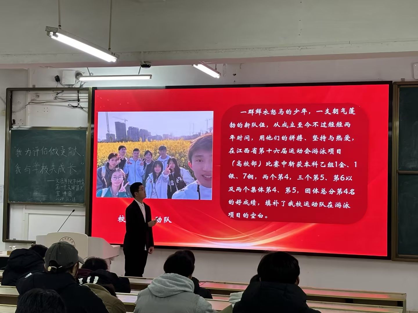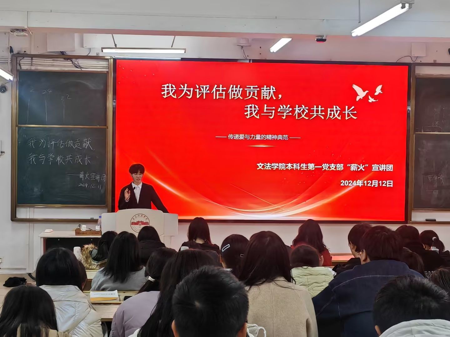 12月11日-12日,WilliamHill威廉希尔本科生第一党支部“薪火”宣讲团面向全体2024级学生开展了“我为评估做贡献,我与学校共成长”主题宣讲活动。活动伊始,宣讲员带领大家共同学唱《赣科学子迎评歌》,让同学们更加直观地了解学校评估的重要性和意义。随后,宣讲员邀请同学们分享身边的榜样故事,通过讲述优秀学长学姐和教师在评估工作中的先进事迹,激励同学们向他们学习,为学校迎评促建贡献青春力量。