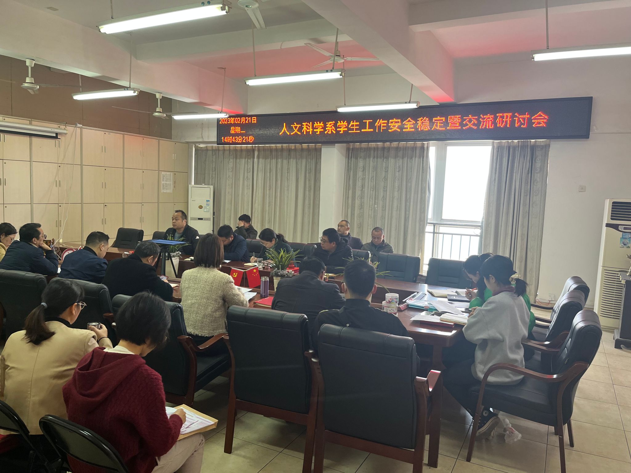 本网讯:为了进一步做好师生心理健康和安全教育工作,切实落实春季学期学校安全工作,确保校园安全稳定,筑牢校园安全堤坝,2月21日下午,人文科学系召开学生工作安全稳定暨交流研讨会,人文科学系主任高健婕、党总支书记李国鹏、副主任何建军、主任助理王军堂、全体辅导员及班主任参加了此次会议,会议由主任助理王军堂主持。